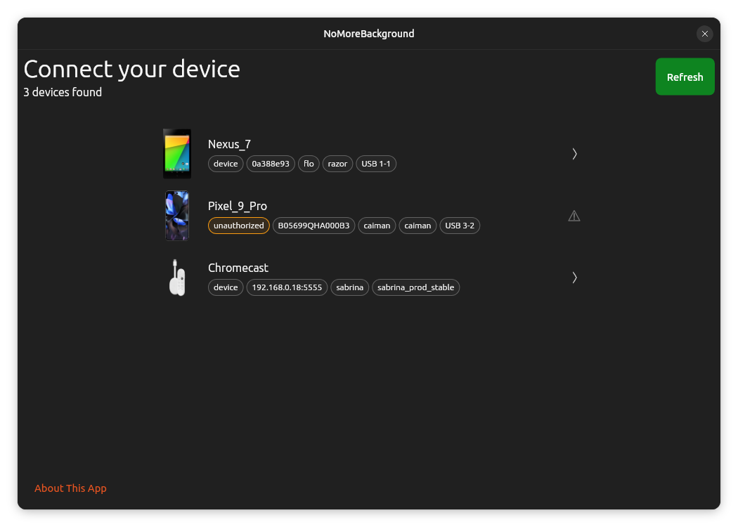 - https://raw.githubusercontent.com/adil192/no_more_background/refs/heads/main/metadata/en-US/images/flathubScreenshots/1_connect.png