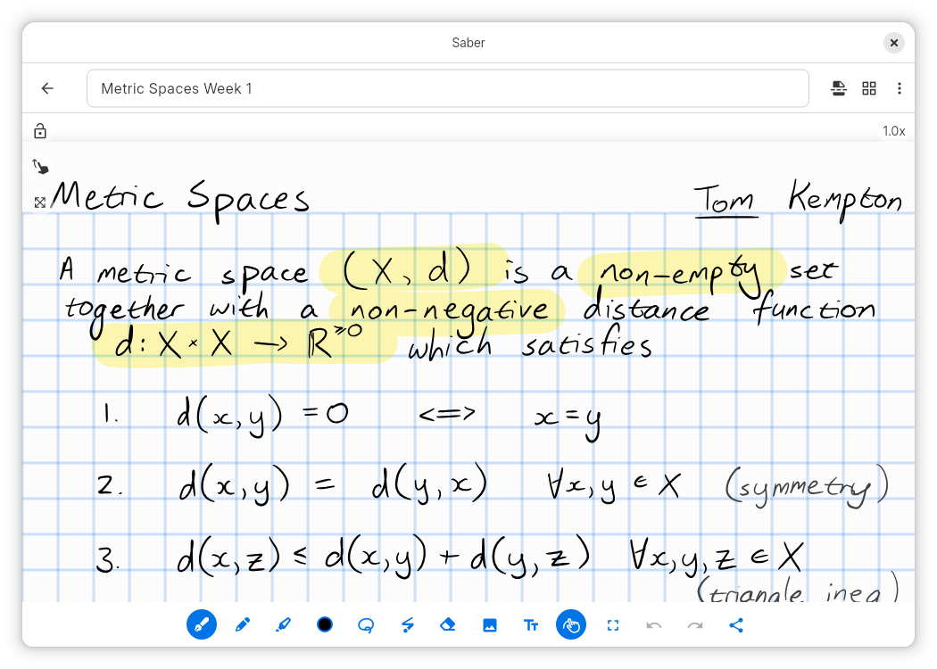 As someone who studies maths, highlighting multi-line equations was always a hassle with other apps, where the highlighter would change color when it overlapped with itself. Another problem I had was that in some apps, the highlighter would render on top of the text, fading it out and making it hard to read. Saber's highlighter has no such issues. It utilizes canvas compositing to render the highlighter in a way that is consistent with/better than traditional paper, where it handles overlaps and maintains color consistency.