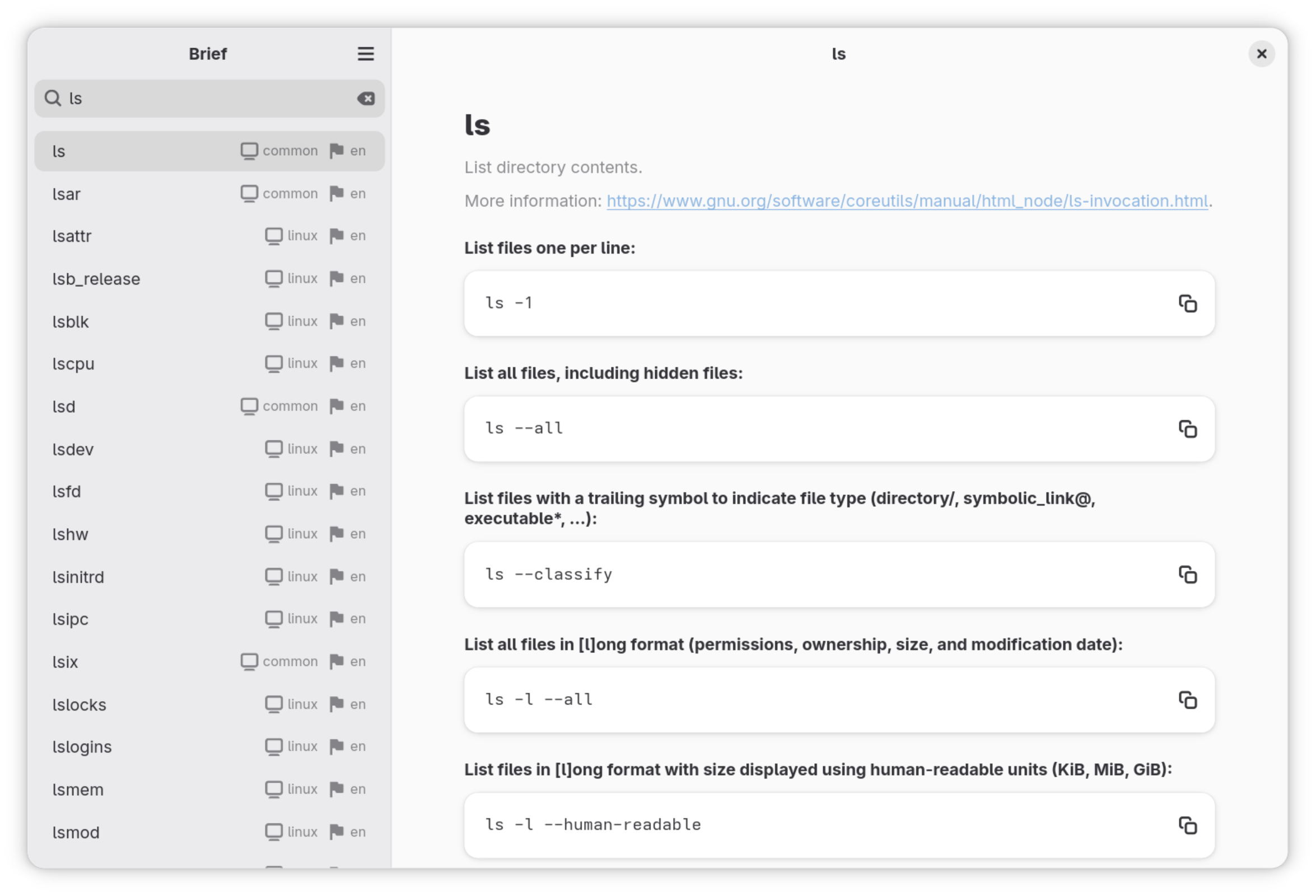 Brief is a GTK4 application for browsing tldr-pages. It provides a clean, native interface to view community-maintained help pages for command-line tools.