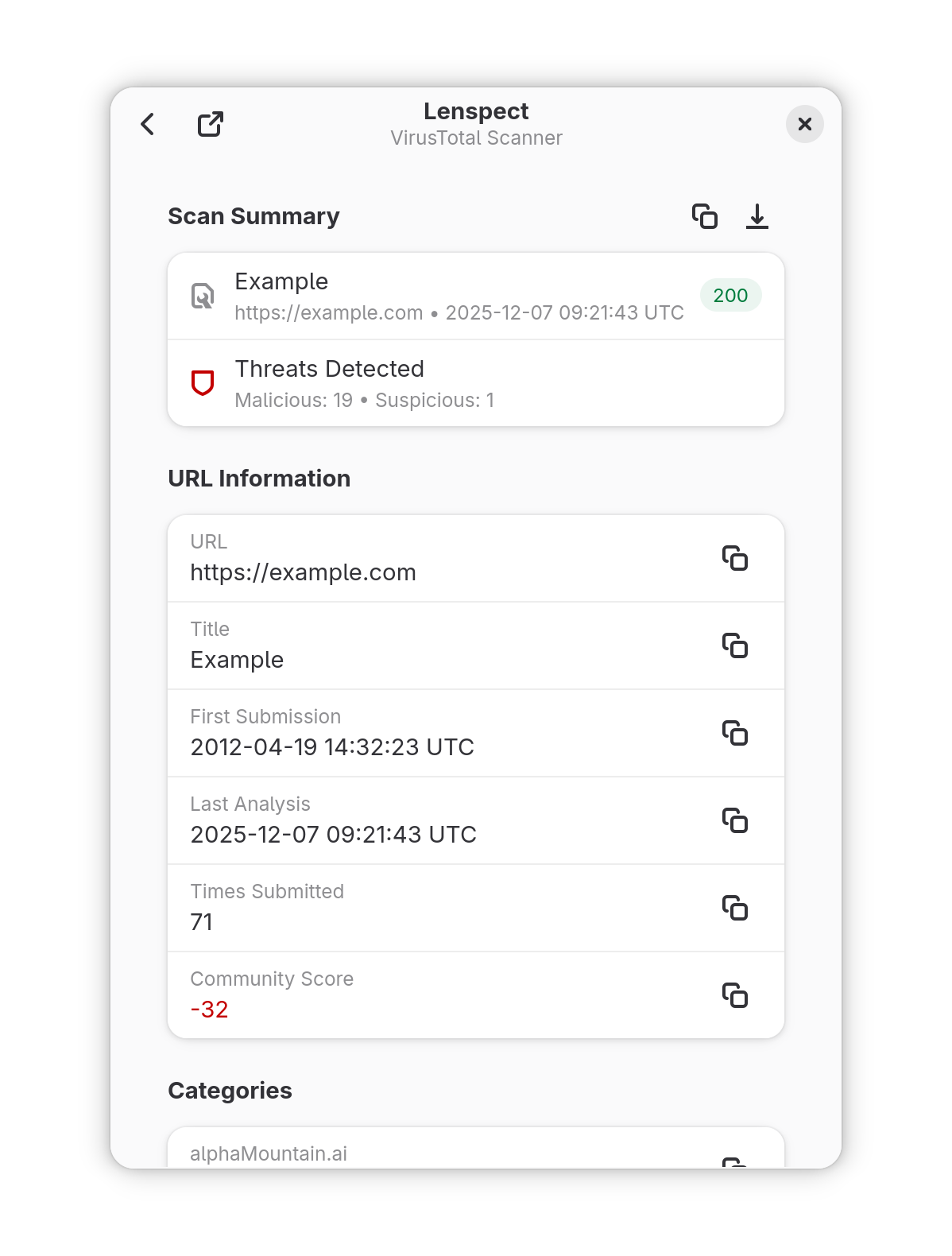 Requires VirusTotal API key. Fully mobile-friendly since release v1.0.1.