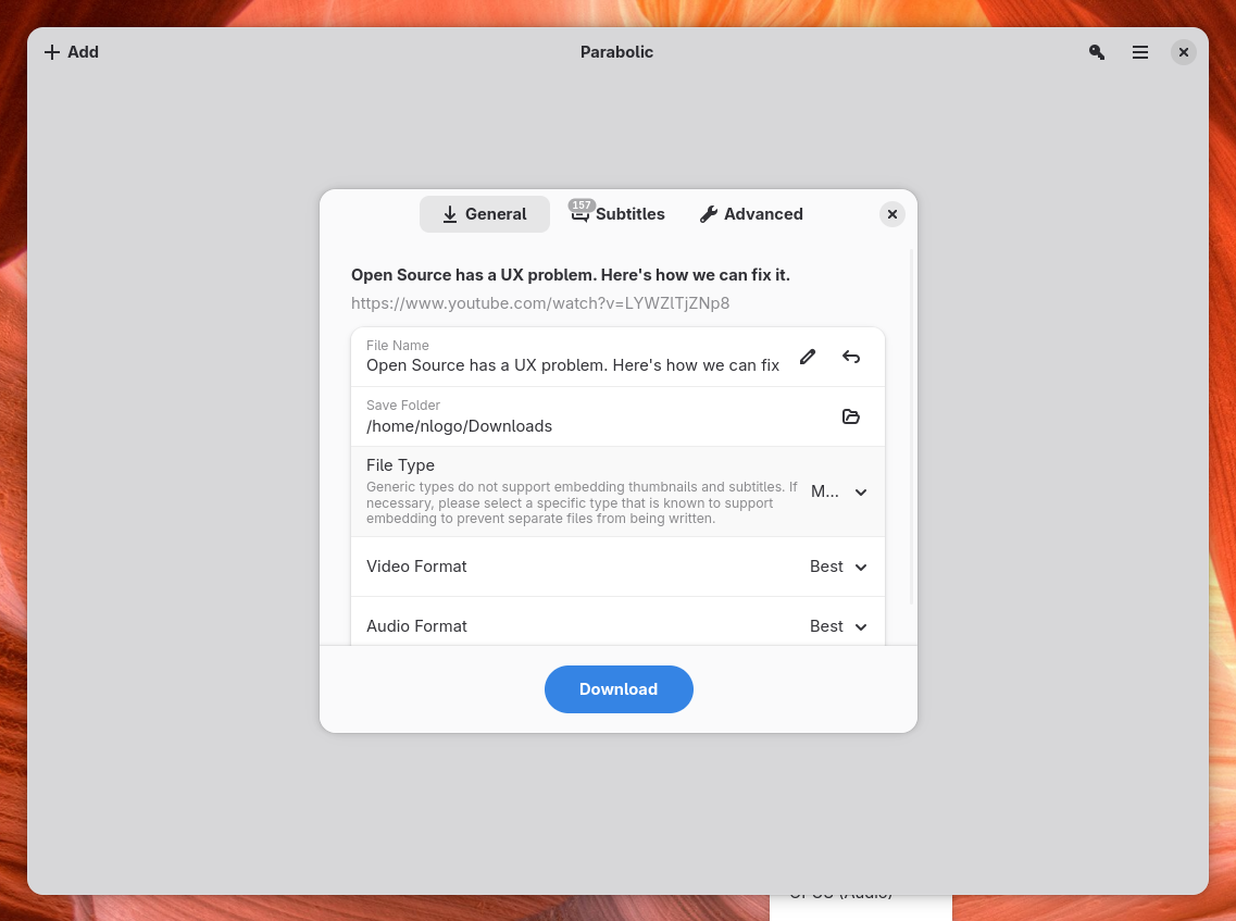 Build and install your own Snap: https://raw.githubusercontent.com/NickvisionApps/Parabolic/main/snap/snapcraft.yaml