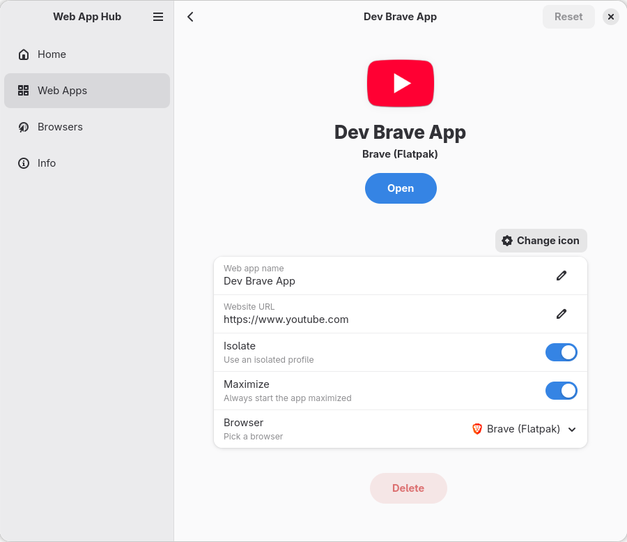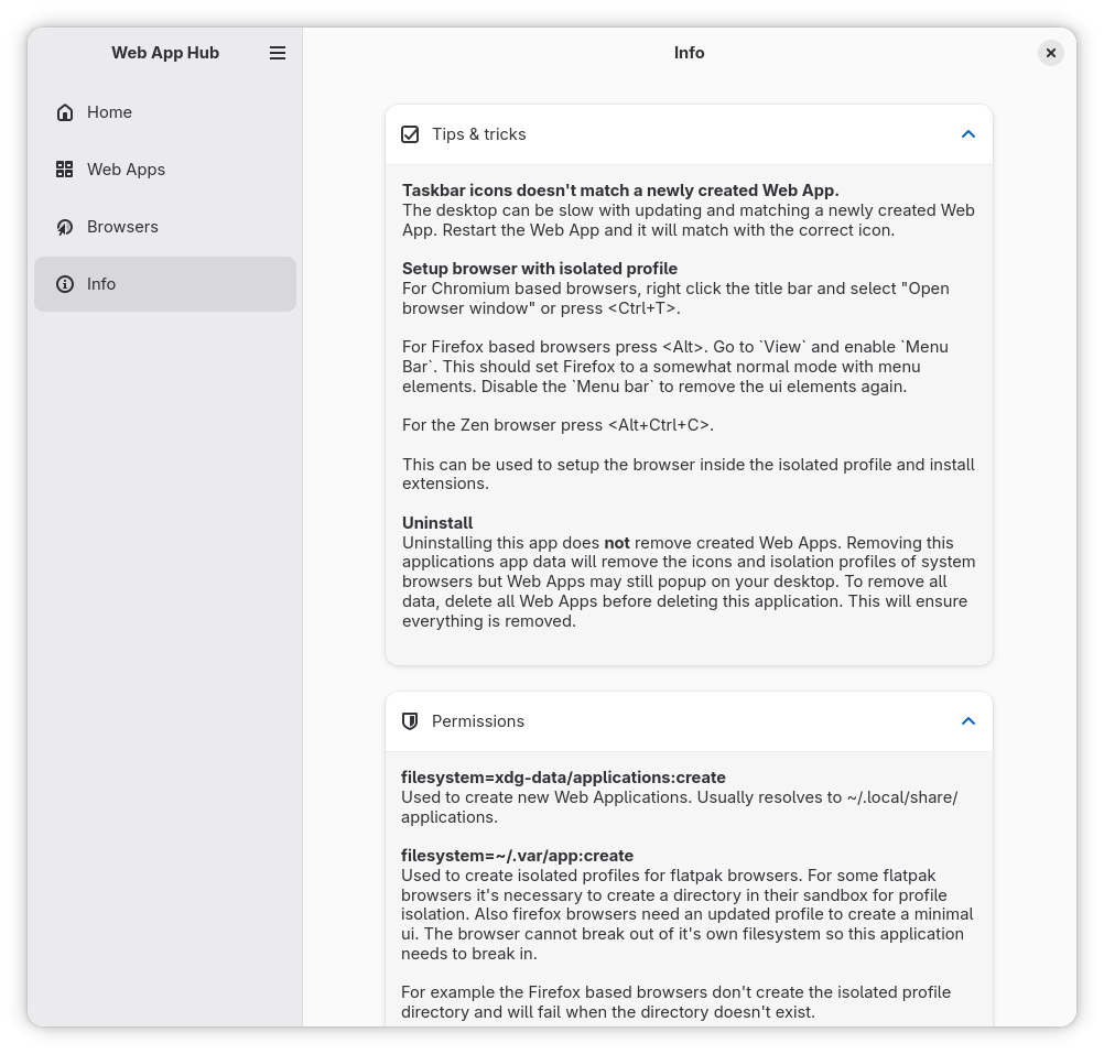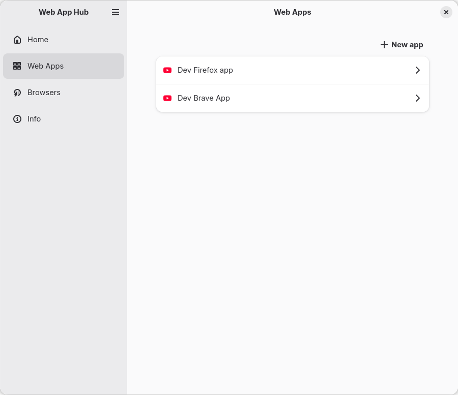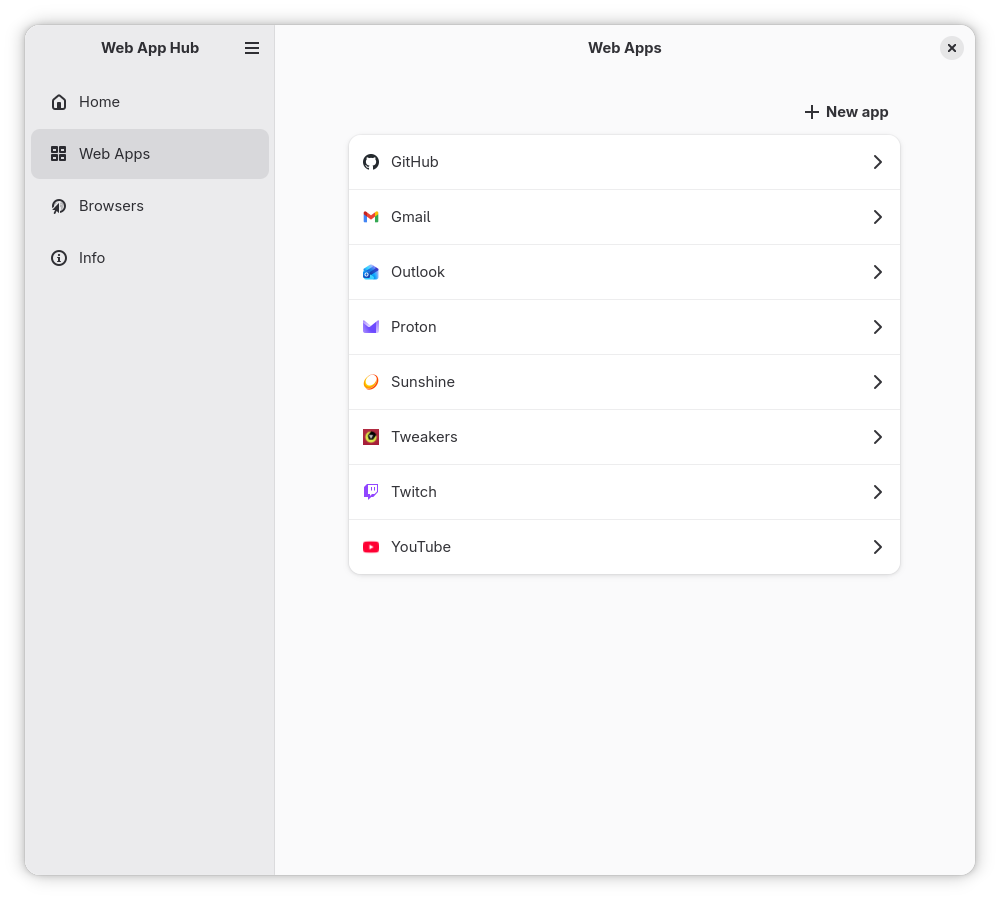 A Web App Manager, written in rust with GTK and beautiful Adwaita. With Web App Hub you can manage your Web App with ease. All apps will have their own icon and can be isolated from the normal browser profile.