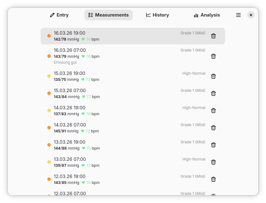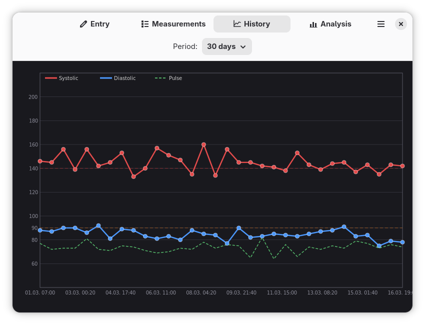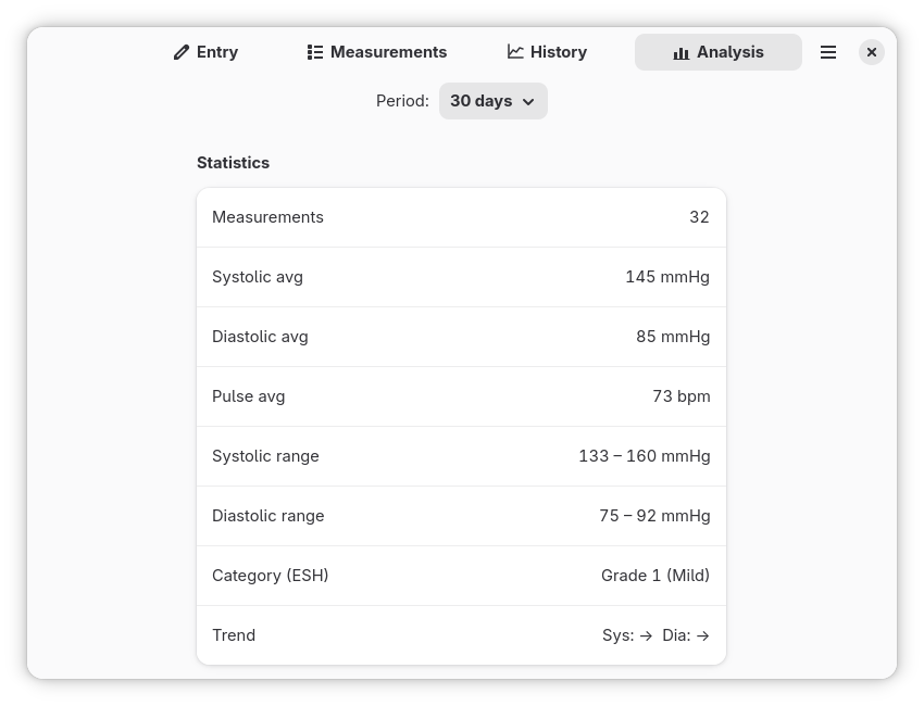 Blood Pressure lets you log systolic and diastolic blood pressure and pulse, view trends in charts, and analyse statistics according to ESH/ESC guidelines.
